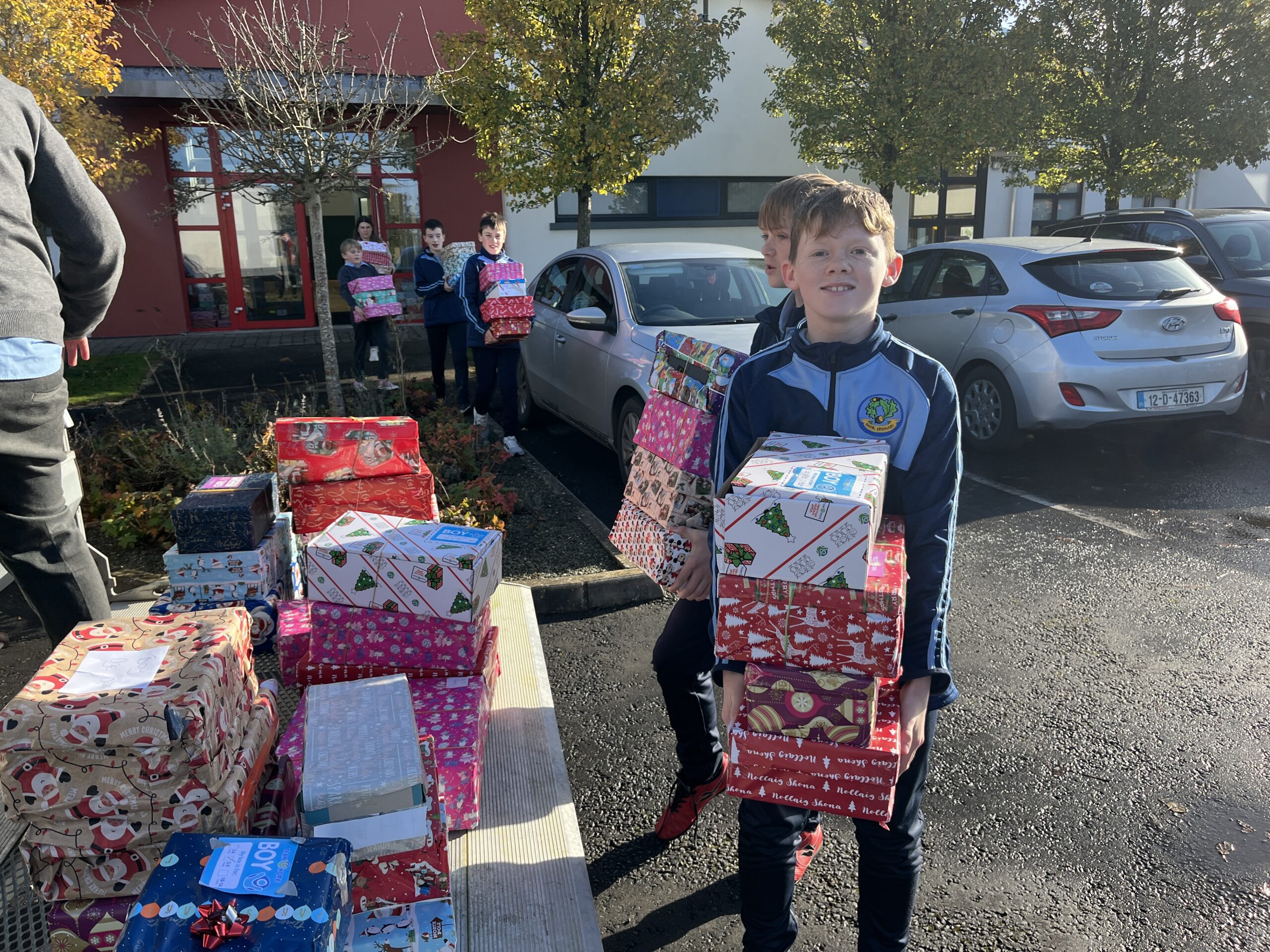 Scoil Fhionáin spreads Christmas message of giving. Sixth Class boys carrying shoeboxes to the truck.
