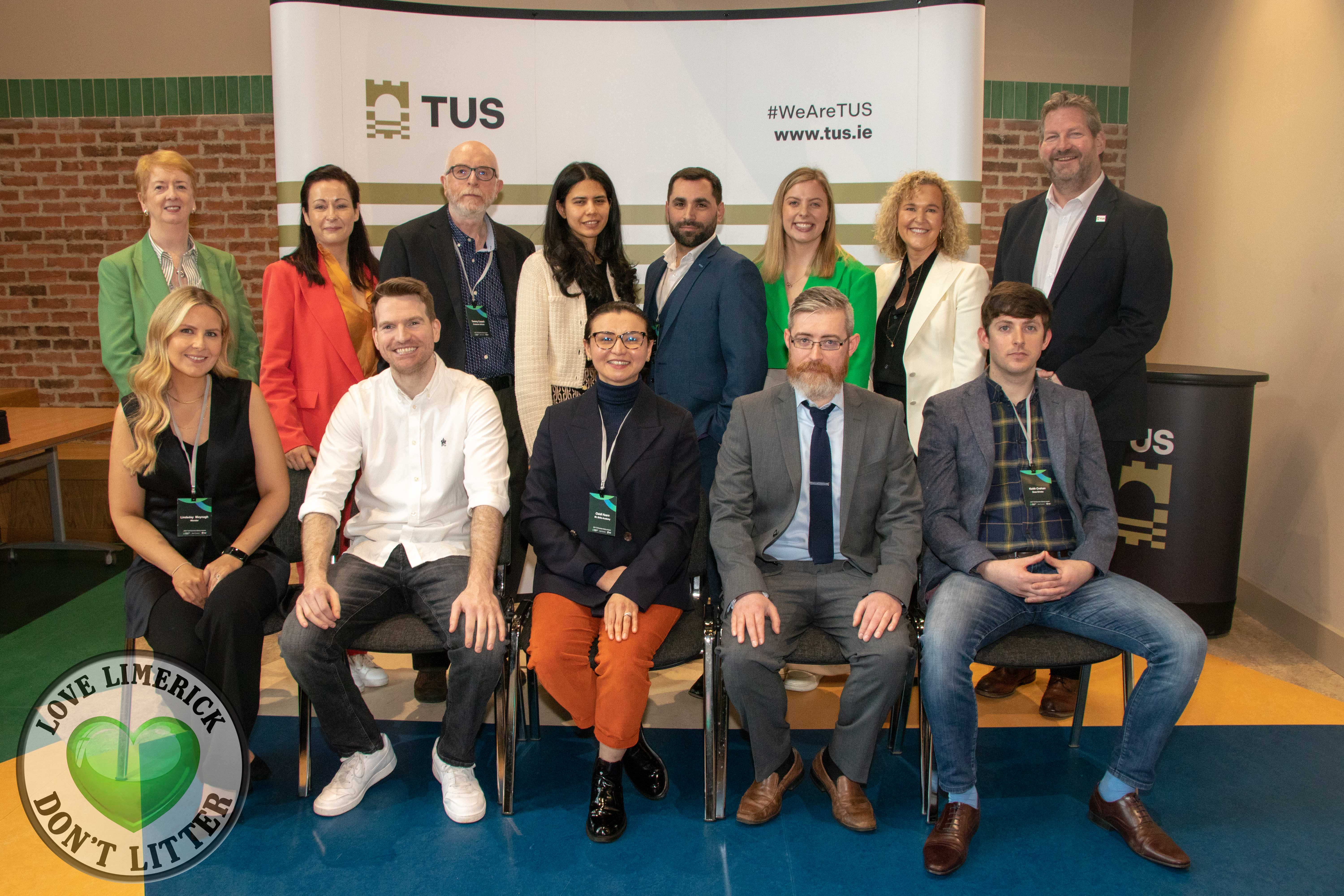 TUS 2024 Startup Awards – Pictured above are New Frontier participants Brian Sheehan, Flare Football, Aisling Walsh, SubConnect, Cleidi Hearn, ML Skills Academy, James Drew, DrewAerospace, Fiona Healy, Avatars Fashion, Ixis Santos, Forest Mist Skincare, Keith Crehan, Deas Drinks and Thomas Cusack, Crossover Airlines (back row) with Gillian Barry, TUS Head of Innovation & Enterprise, Margaret Power of SiBark, Winner of the Innovation Award, Adem Ergen of One Bill Utilities, Winner of the Overall Business Award, Lindsay Moynagh of Wendor, Winner of the One to Watch Award, Paula Carroll, National Programme Manager, New Frontiers Enterprise Ireland and Dr Liam Brown, TUS VP Research, Development and Innovation (front row) Picture: Cian Reinhardt/ilovelimerick
